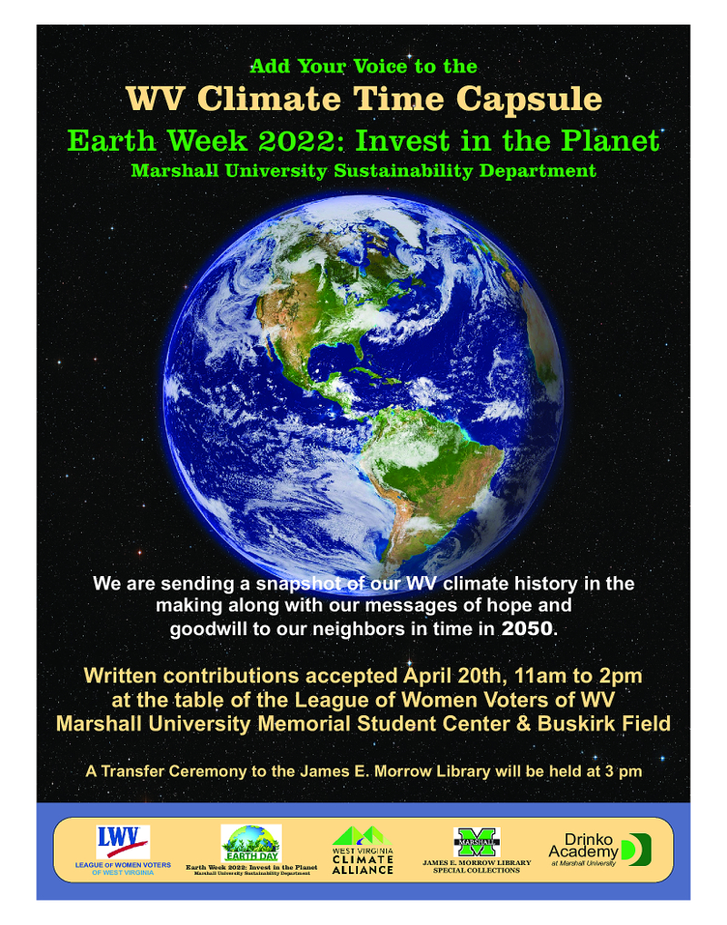 The WV Climate Time Capsule began as a contributing activity by the League of Women Voters of WV to a climate rally sponsored by the WV Climate Alliance in October of 2021. The contents contain contributions from multiple organizations, research on alternative energy technologies, articles that document current events that are shaping our WV Climate future, correspondence and more. The WV Climate Time Capsule also carries prayers, hopes and wishes to our neighbors in time, that we are working hard now to ensure their right to call this beautiful planet Earth their home. Nyoka Baker Chapman, LWVWV Natural Resources Committee, Chair